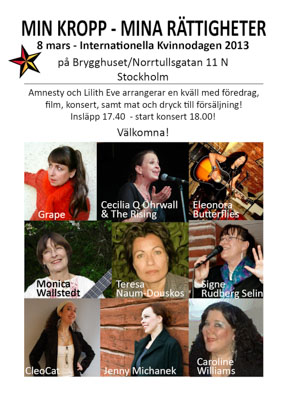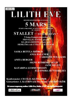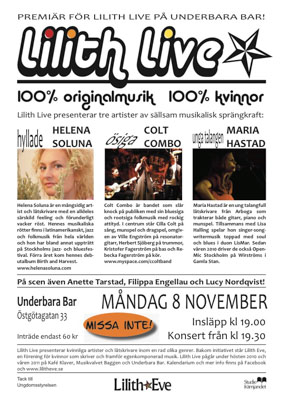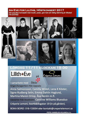 En konsert på internationella kvinnodagen med en grupp kollegor var själva upprinnelsen till Lilith Eve. Under åren har Lilith Eve arrangerat många spännande evenemang och projekt, som Liliith Eve i Kungsan, Lilith goes symphonic, programserien Radio Lilith,, Lilith Eve Collection no.1, Q Music Network, Öppen scen och seminarier.